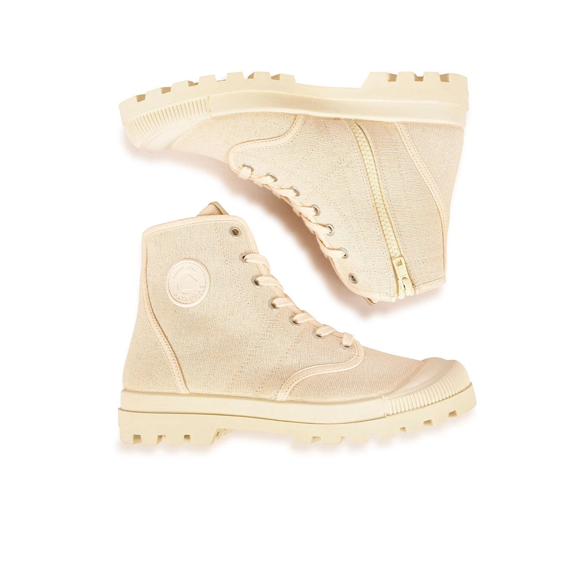 Découvrez la nouvelle version de la boots femme Authentique. Cette saison, la boots traditionnelle et iconique de Pataugas est munie d’une toile déclinée avec un zip intérieur pour faciliter l’usage et est montée sur une semelle crantée en caoutchouc naturel. En plus de sa couleur épurée, cette chaussure en toile et fil lurex est ultra-souple grâce aux nouvelles matières utilisées. C’est une boots parfaite pour la baroudeuse moderne en quête de confort et de style.