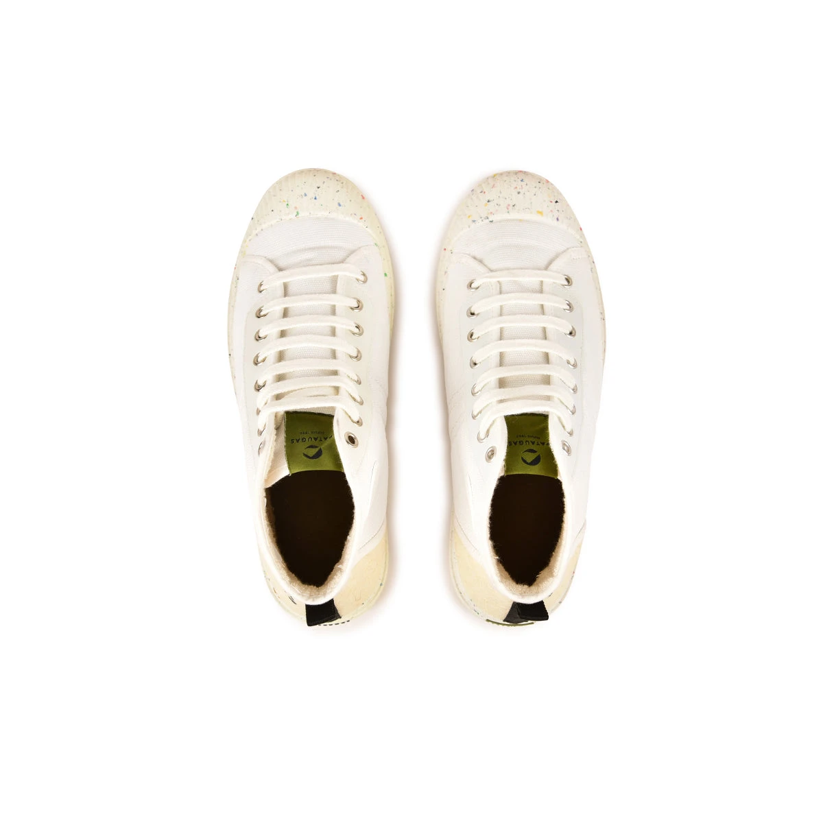Entièrement Vegan, cette basket femme en toile se compose d’une semelle en caoutchouc naturel, partiellement recyclé et d’une tige en textile Seaqual, fabriqué à partir de déchets plastiques marins. La doublure, la première de propreté en mousse et les lacets en coton sont issus de matériaux entièrement recyclés et l’empiècement situé à l’arrière de peau d’ananas.