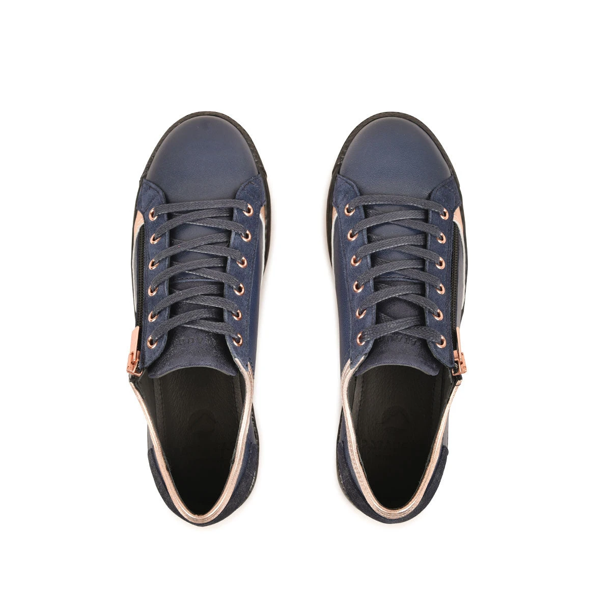 Découvrez la chaussure en cuir pour femme idéale pour conjuguer vos envies de marche avec votre féminité. La basket pour femme JESTER, est munie d’une fermeture en cuir très pratique, d’un mix de cuir bleu marine et rose très élégants et d’une semelle confortable. Cette chaussure a été conçue dans nos ateliers au Portugal.