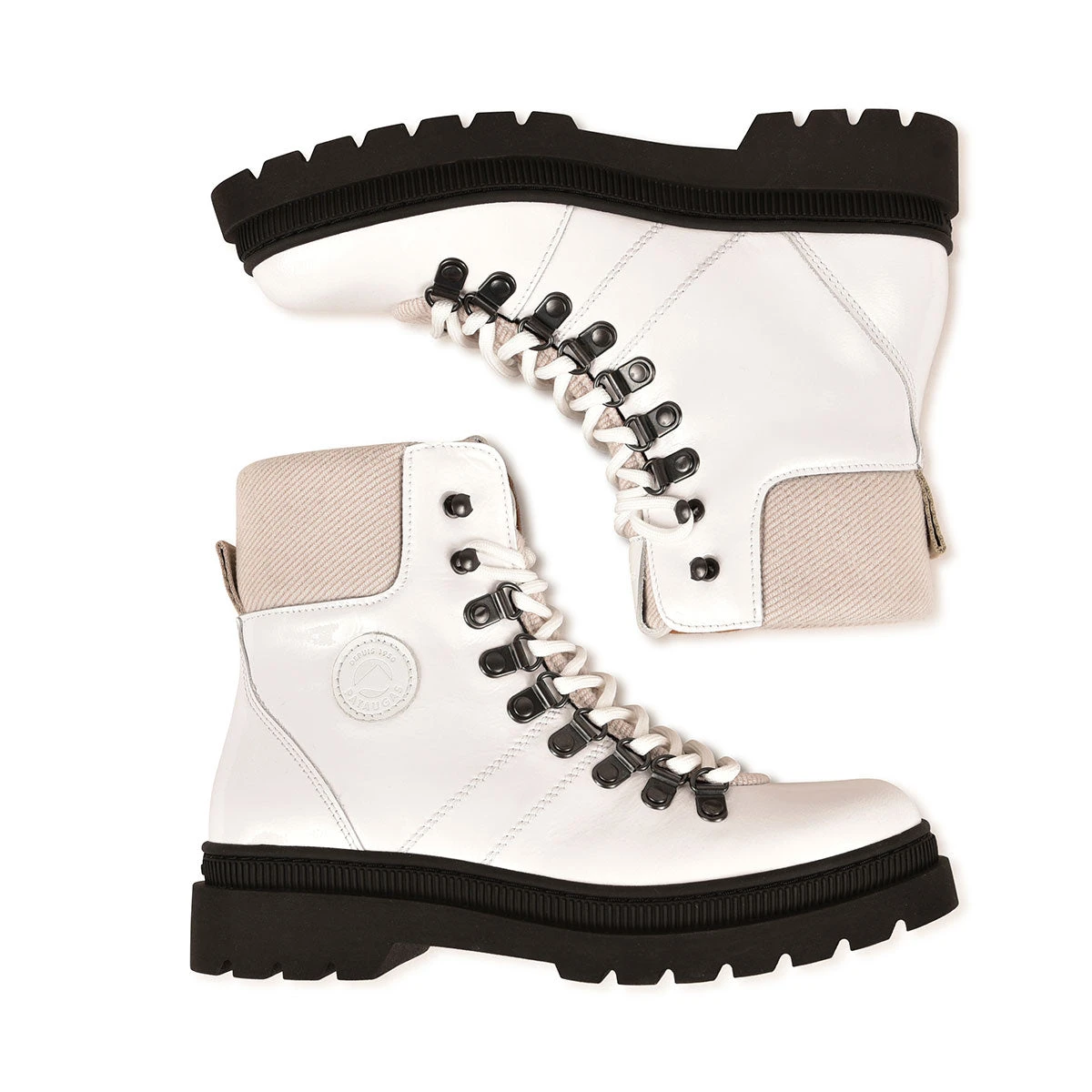 Inspirée du brodequin d’alpinisme vintage, la boots femme NISTOS revient cette saison avec une version très féminine. Ses œillets métalliques rappellent les chaussures de randonnée et son cuir verni blanc apporte la touche shiny à cette chaussure. Sa semelle épaisse héritage vient du savoir-faire de nos artisans au Portugal. C’est une boots qui mélange plusieurs codes pour un rendu moderne et tendance.